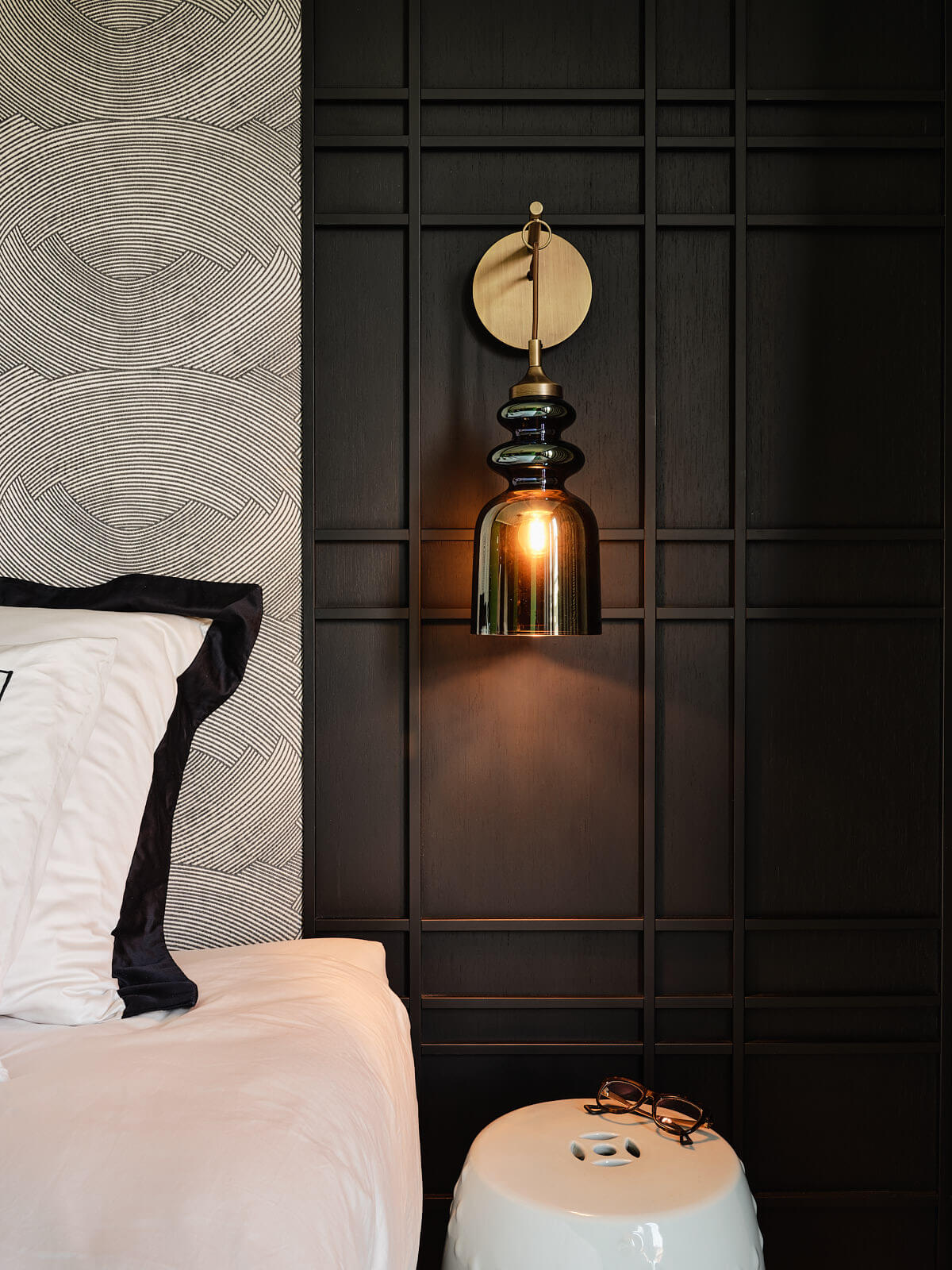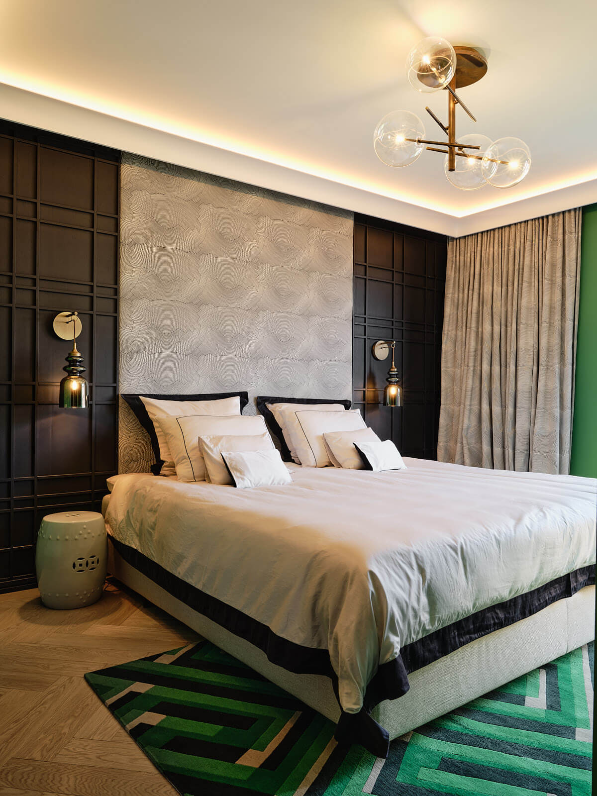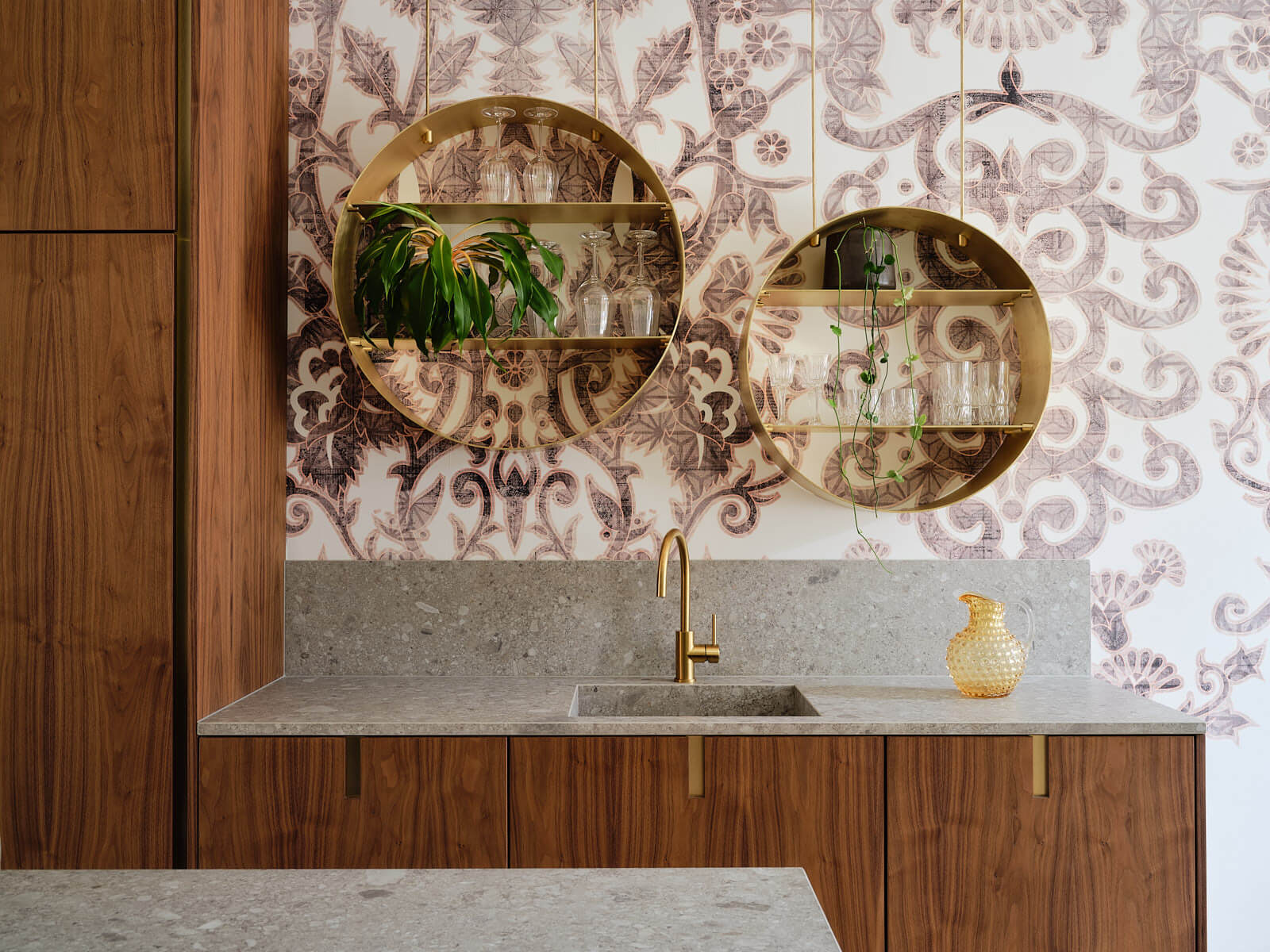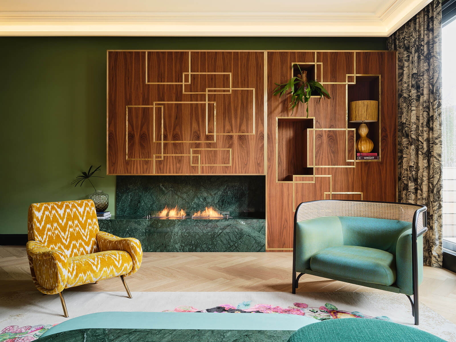 Dit warme kosmopolitisch interieur is ontworpen door interieurarchitect Roelfien Vos en combineert luxe en comfort door een mooie mix van notenfineer, messing, staal en marmer.
